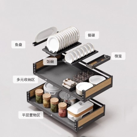 Goldmine shallowest pullout baskets as top levels, different sizes can be supplied 400/500/600/700/800/900mm cabinet size, with movable dividers, can store small stuffs .