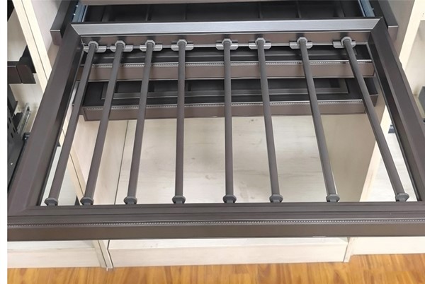 A pull-out trouser basket is a sliding storage basket installed in wardrobes or cabinets. It is used for folded pants, jeans, leggings, towels and clothing. It slides smoothly on rails, allowing easy access and keeping clothes tidy and wrinkle-free. It saves space and makes the closet more organized.