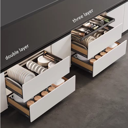 Goldmine shallowest pullout baskets as top levels, different sizes can be supplied 400/500/600/700/800/900mm cabinet size, with movable dividers, can store small stuffs .